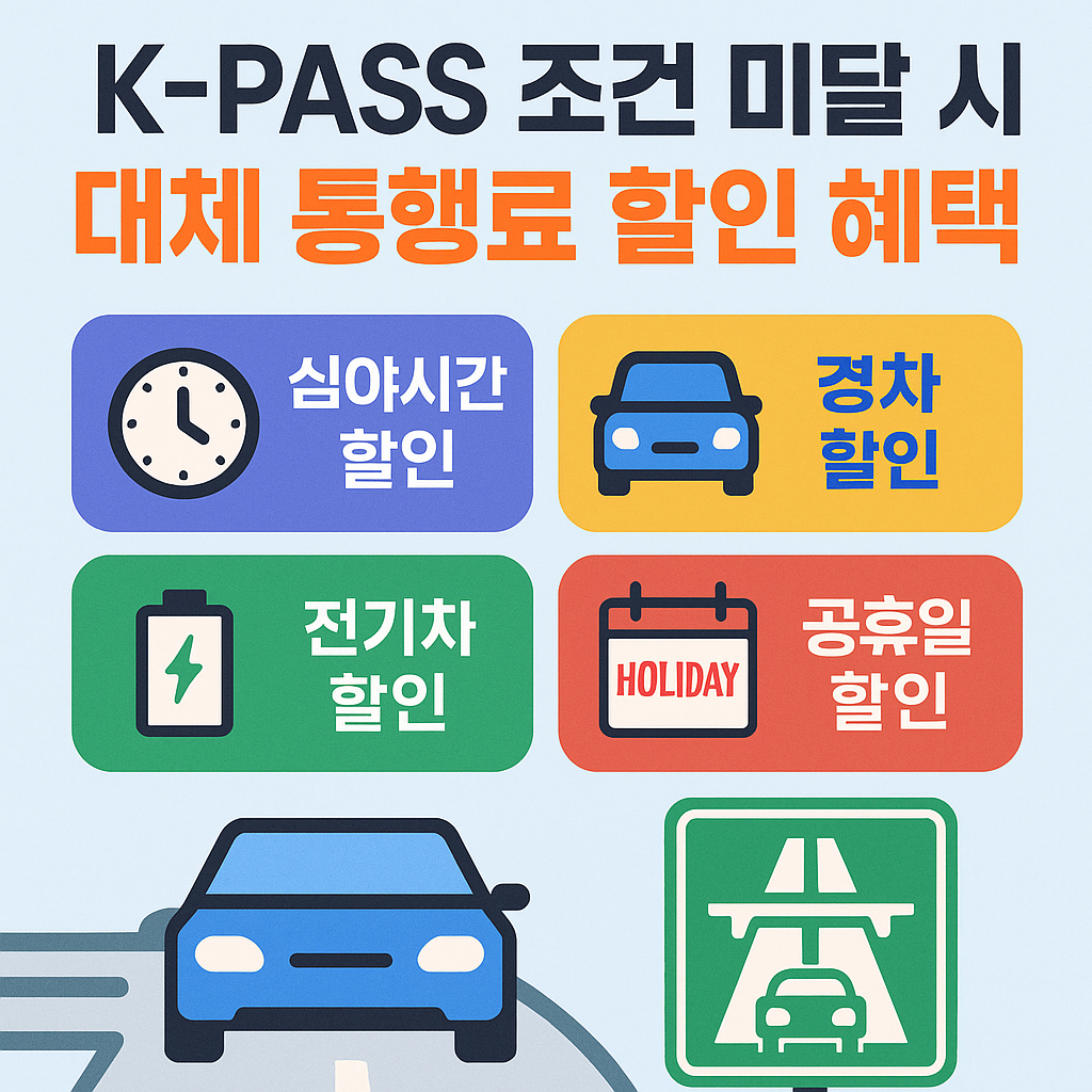 K-PASS는 장거리 출퇴근 차량을 위한 유용한 할인 제도지만, 월 15일 이상 동일 구간을 왕복하지 않거나, 하이패스 단말기가 없으면 혜택을 받을 수 없습니다. 그렇다고 포기하지 마세요! K-PASS 조건을 충족하지 못해도 다양한 대체 할인제도가 있습니다. 지금부터 그 혜택들을 정리해볼게요.